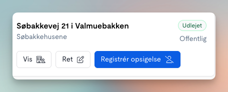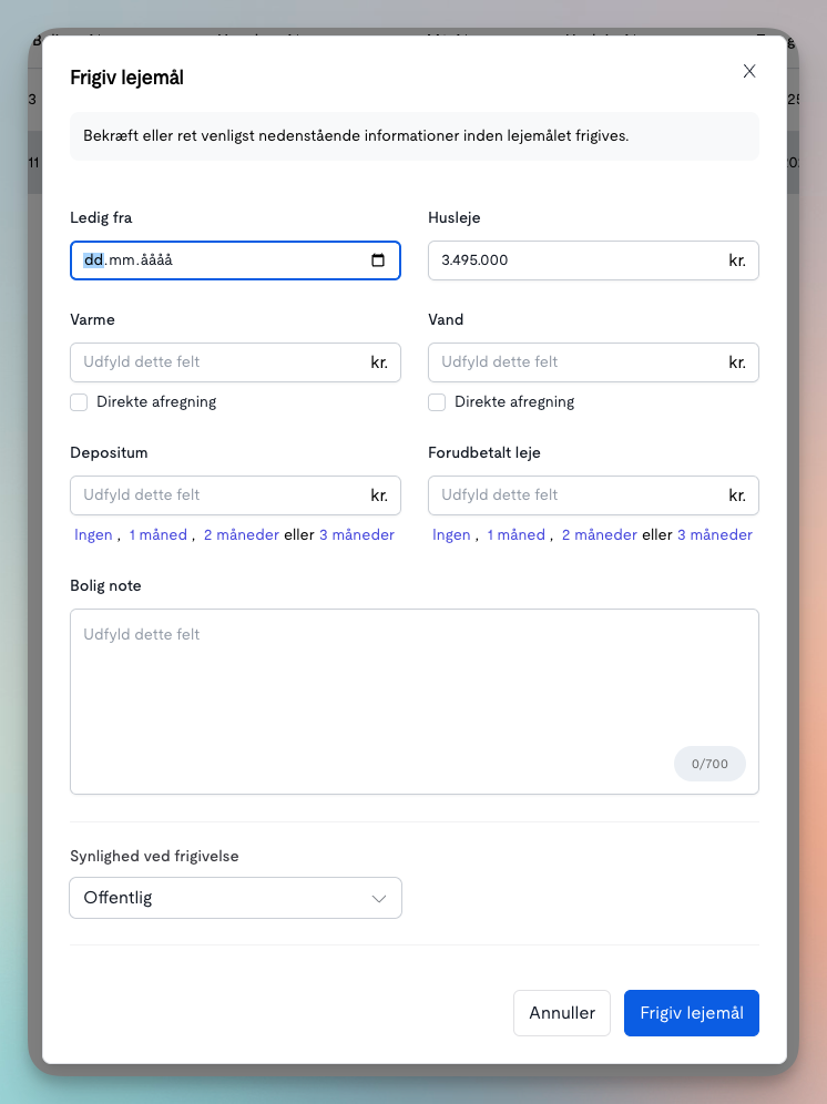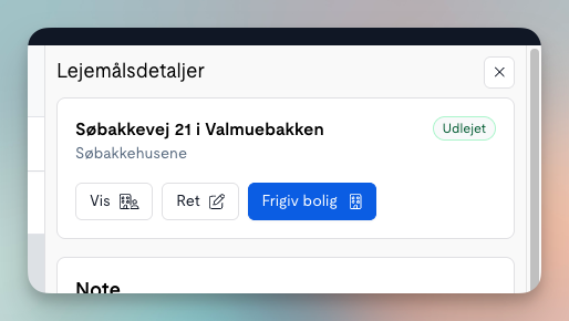 Når der trykkes på "frigiv" lejemål, vil lejemålet få status "ledig" samt den valgte synlighedsstatus.