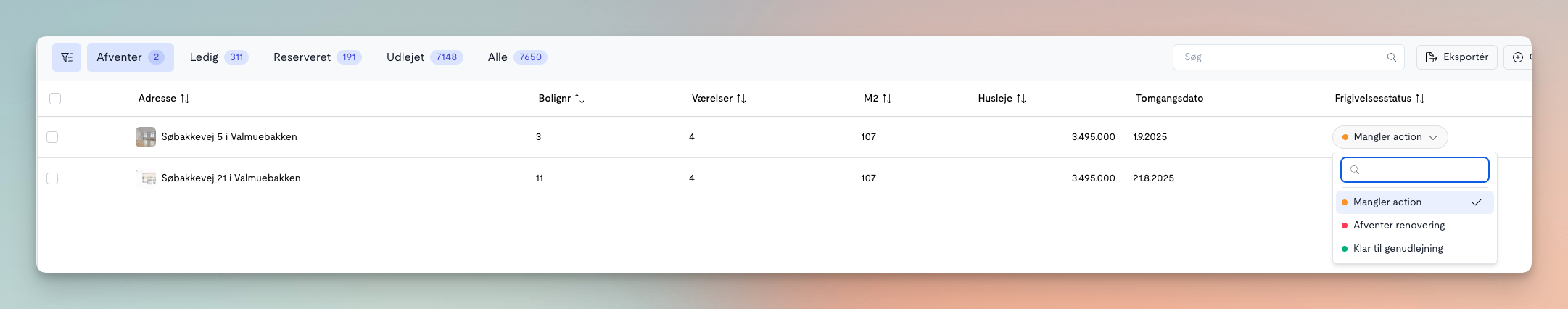 I denne status ligger lejemålet med en afventende status inden det frigives og offentliggøres til genudlejning. Der kan vælges hvilke statusser der er gældende for hvert lejemål, som skaber overblik og struktur i den afventende fase.