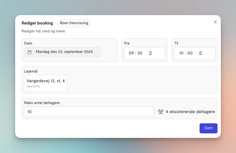 - Hvis du vil redigere fremvisningen, kan du trykke "rediger booking" og herefter rette tidspunkt (man kan dog ikke rette dato, såfremt der er tilmeldte på fremvisningen) og eventuelt rette antal maksimale deltagere. (Der sendes en mail når det er individuel fremvisning når der ændres i tiden).