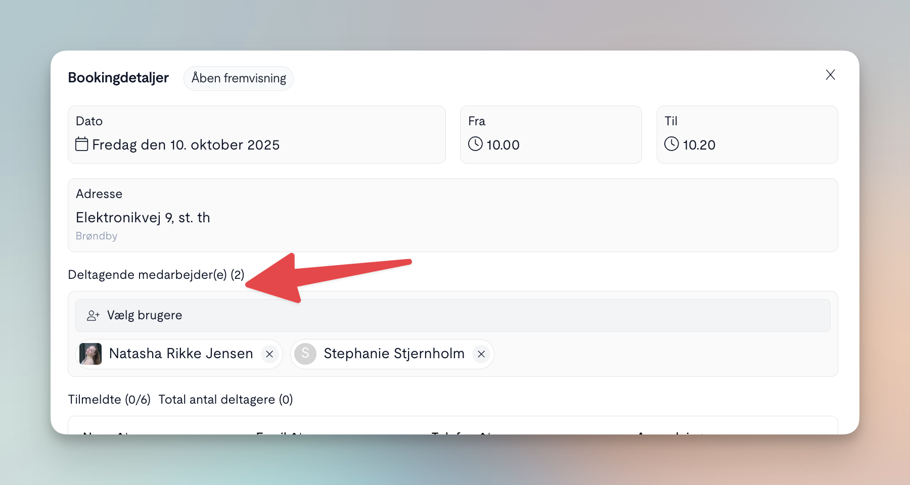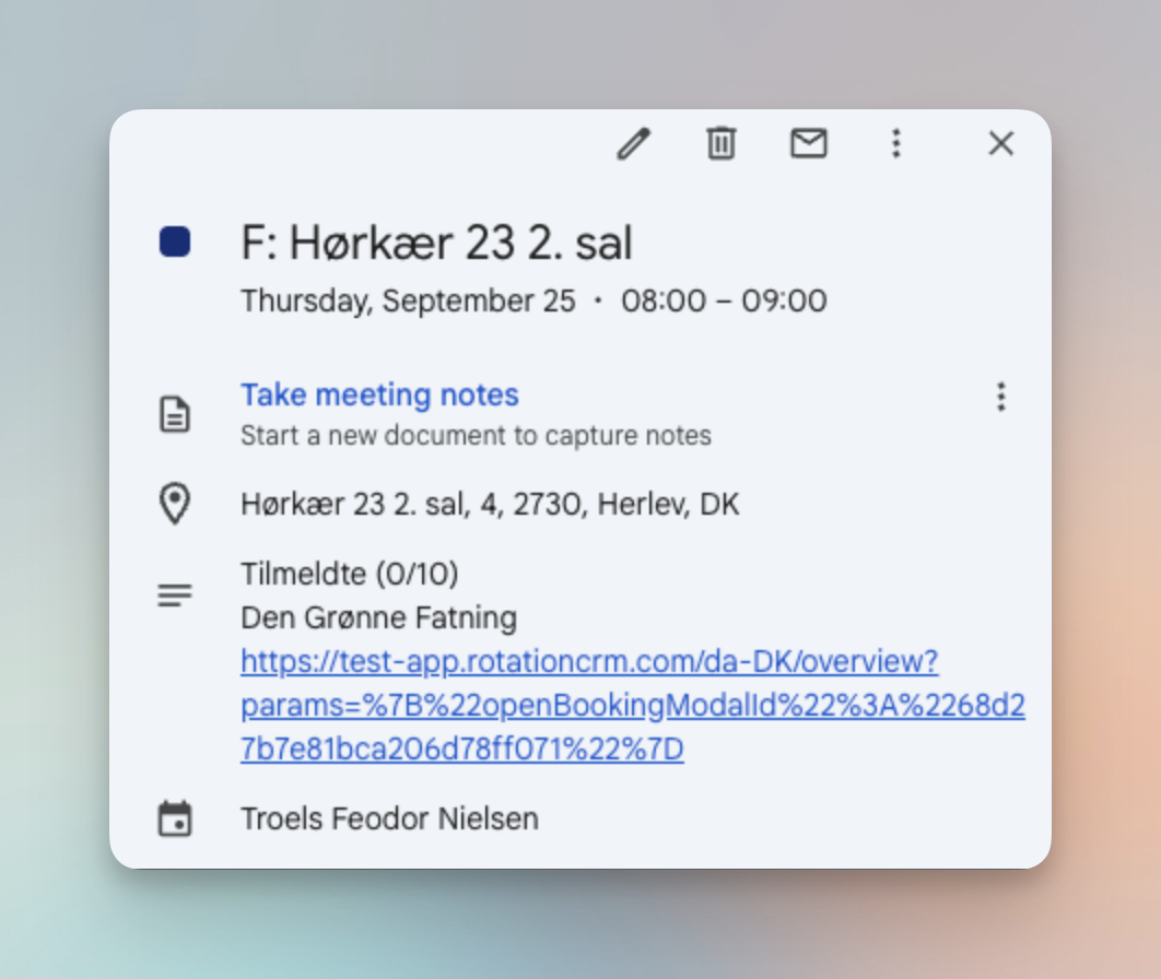 Beskrivelsen inkluderer et løbende opdateret antal tilmeldte samt navnet på ejendommen. Derudover er der et direkte link til bookingens detaljer på Overblikssiden i Rotation, hvor du kan se detaljer på deltagerne og eventuelt foretage ændringer.