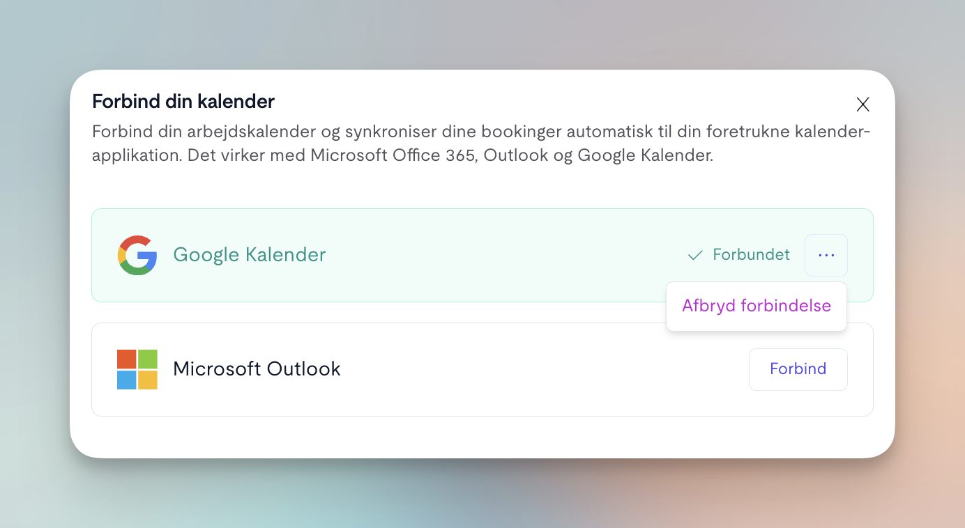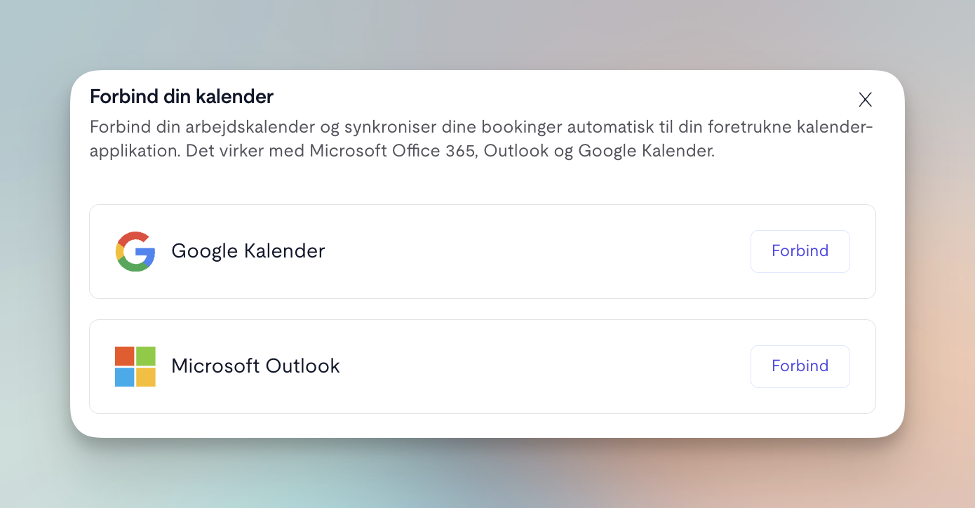 - For at starte opsætningen skal du via Overblik under dine bookinger, trykke på "Forbind kalender" og herefter vælge om du vil synkronisere til Google Kalender eller til Microsoft Outlook.