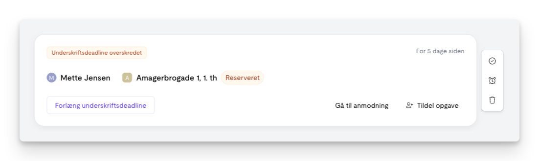 Opgaver oprettes automatisk i situationer, hvor der kræves handling – fx hvis en deadline overskrides, eller hvis der kun mangler jeres underskrift på en kontrakt.